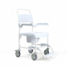 Легко транспортируется и чистится, имеет откидные подлокотники и выдвижную подножку, регулируемую по глубине и складывающуюся под шасси для облегчения перемещения. Кресло имеет удобное широкое сидение из гигиенического пластика, легко дезинфицируется и приятно на ощупь. Туалетное ведро в комплекте.